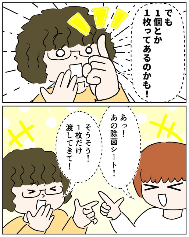 さらに「でも1個とか1枚ってあるのかも!」と何かを閃いたかのように話すシノブさん。その言葉を聞いて「あっ!あの除菌シート!」と私が思い出してそう言うと、「そうそう!1枚だけ渡してきて!」と思い出して思わず笑ってしまいました。