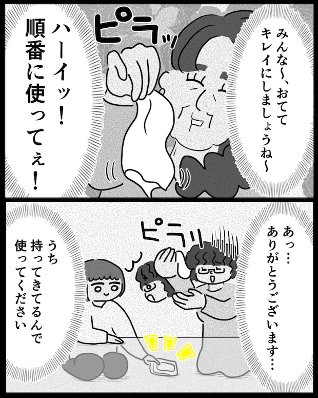 「みんな~おててキレイにしましょうね~!ハーイッ!順番に使ってぇ!」そう言って差し出したのは除菌シート1枚のみ。「あっ・・ありがとうございます・・」動揺しながら受け取るシノブさんに「うち持ってきてるんで使ってください」とそっと除菌シートを差し出すと、