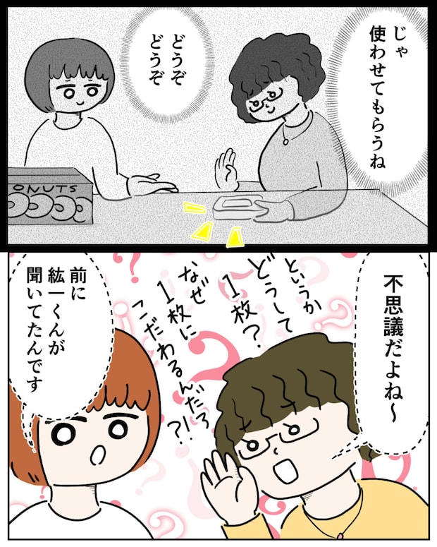 「じゃ、使わせてもらうね」とシノブさん。「どうぞどうぞ」と私が答えると、「不思議だよね~。というかどうして1枚?なぜ1枚にこだわるんだろ!?」と意味がわからない義母の行動を耳元で囁くシノブさんに、「前に紘一くんが聞いてたんです」と切り出す私。