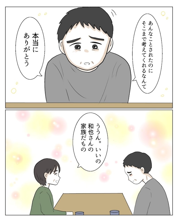 私の言葉を聞いた和也さんは、「あんなことされたのにそこまで考えてくれるなんて、本当にありがとう」と申し訳なさそうに頭を下げました。私は優しく微笑みながら、「ううん、いいの、和也さんの家族だもの」と声をかけました。