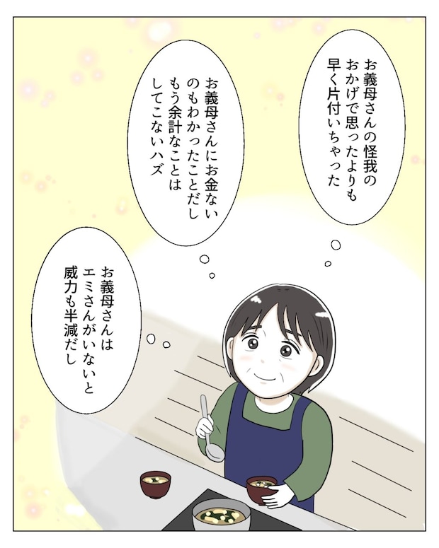 振り返ってみれば、すべては義母が怪我をしたことがきっかけだったのかもしれません。エミさんとタクマくんも、今回の件で義母にお金がないことを思い知ったはずですし、もう余計なことはしてこないでしょう。それに、エミさんがいなければ義母の威力は半減。もはや私にとって敵ではありません。厄介事から解放されて本当によかった。