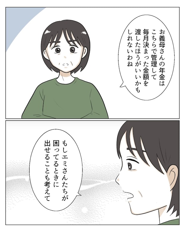 そのうえで、「でも、お義母さんの年金はこちらで管理して毎月決まった金額を渡したほうがいいかもしれないわね・・・もしエミさんたちが困ってるときに出せることも考えて」と、現実的な提案を添えます。