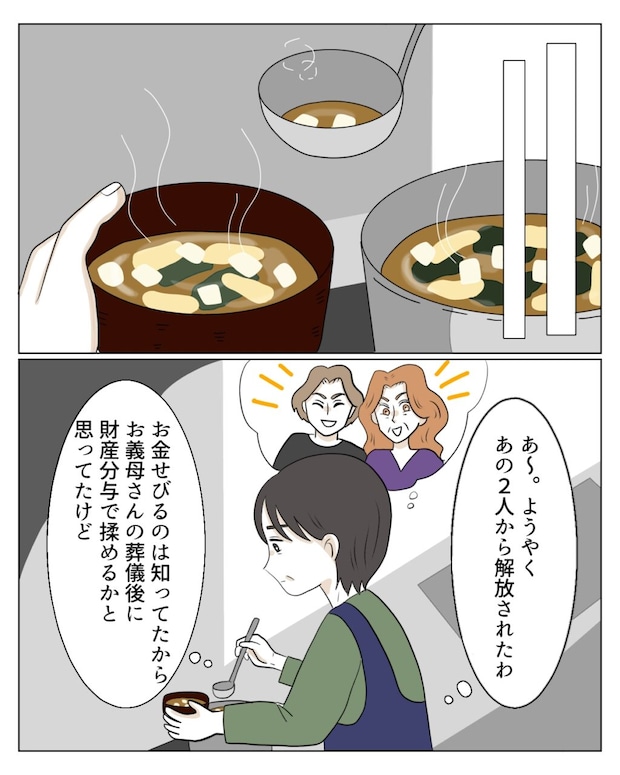 こうしてようやく、私たちはエミさんとタクマくんから解放されました。エミさんはもともとお金に細かい人で、何かとせびってくるだろうことは想像がついていました。義母の葬儀後、財産分与で揉める覚悟もしていましたが、こんなに早く片がつくとは嬉しい誤算でした。