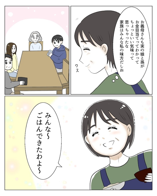 たか子さんは夫の和也さん、大学生の娘真矢ちゃんと受験生の息子孝介くん、そして義母の千代さんと4人で暮らすパート主婦。千代さんは被害妄想が強く、一生懸命お世話をしてくれるたか子さんのことを、意地悪で何もしてくれないひどい嫁だと度々周りに言いふらしていました。ある時、義母が転んで骨折すると、義姉エミさんが社会人の息子タクマさんを連れて毎週末家に来るように。義母は優しい言葉をかけてくれる2人に甘々で、たか子さんたちには一切渡したことのないお小遣いを毎回内緒で差し出していました。そんなある日、義母に孝介くん用に貯めておいた貯金の在処を突然たずねられたたか子さん。どうやら使い込んでいない証拠が見たいようで、エミさんとタクマさんも一緒になって通帳を差し出すよう言います。ここまで献身的に支えているにも関わらず、自分のことを一切信用しない義母に憤りを覚えたたか子さんは、通帳を渡す代わりに同居を解消したい旨を伝えました。和也さんもそれに賛同。貯金していたお金を渡す代わりに、今後義母にかかる費用は全て賄って欲しいと、エミさんたちと暮らすことを提案します。エミさんは、今まで通りお小遣いを貰えなくなることが分かると、義母をあっさりと見捨てて帰っていきました。しかし、たか子さんだけは義母を見捨てることはせず、今まで通り優しく接します。そんなたか子さんを見た真矢さんと孝介さんは、彼女の考えを「甘い」と一蹴しました。
