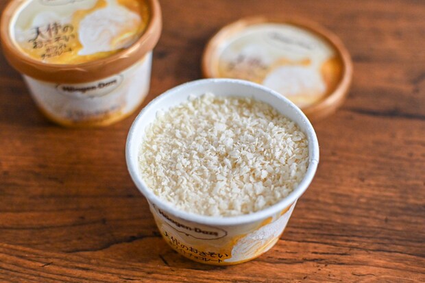 天使のおさそい ホワイトチョコレートは、ホワイトチョコソースを加えたホワイトチョコアイスクリームの上にミルクコーティング、ホワイトフィアンティーヌ※をのせたホワイトチョコレートフレーバー。