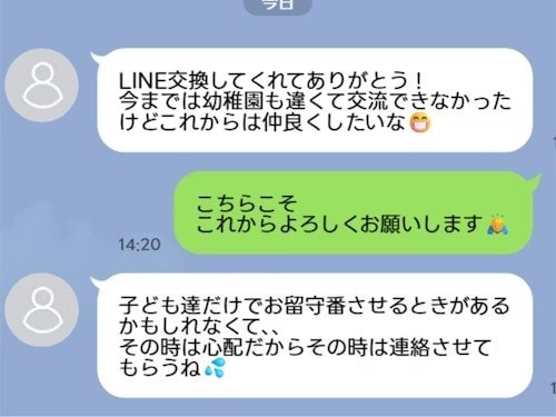 下の子同士一緒に行こうよと言われたときにLINE交換しようよと言われて交換してしまったのですが、ママさんからは今までは幼稚園も違くて交流できなかったけどこれからは仲良くしたいと言われました。私は仲良くしたいとは言わずに、これからよろしくお願いしますと返信したのですが、ママさんから、子ども達だけでお留守番させるときがあるかもしれなくてその時は心配なからその時は連絡させてもらうねと連絡がきて、それは預かってほしいってことか、だから急に距離が近くなったのかと思い、既読スルーしていました。
