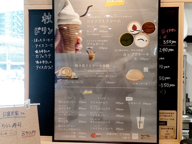 枝カフェさんは、ソフトクリームやその日の焼き菓子やドリンクなどを売っています。お店でテイクアウトして、役所内にあるテーブルで食べれますよ。