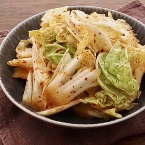 <材料> 白菜、にんにくチューブ、粉唐辛子、塩、砂糖、ごま油
