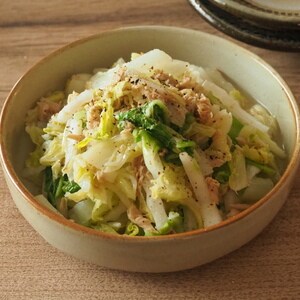 <材料> ツナ(オイル煮)、白菜、○鶏ガラスープの素、○にんにくチューブ、○ごま油、○塩・こしょう