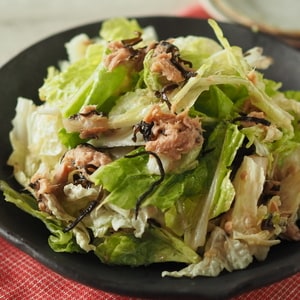 <材料> 白菜、ツナ缶詰(オイル煮)、塩昆布、いりごま(白)