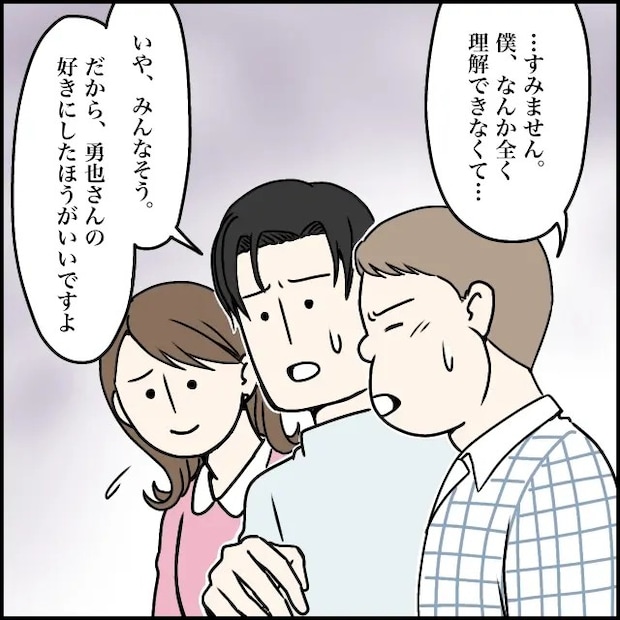 勇也さんは、「・・・すみません、僕なんか全く理解できなくて」と言って複雑な表情を浮かべます。すると太一が、「いや、みんなそう・・・だから勇也さんの好きにしたほうがいいですよ」と、背中を押すように声をかけました。
