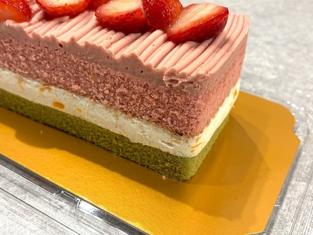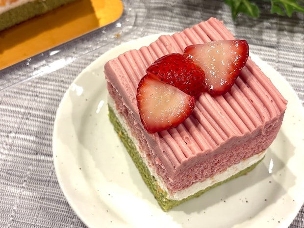 期間限定で販売された「スプリングバーケーキ」は、菱餅のように桃色、白色、緑色が層になった華やかなケーキ。