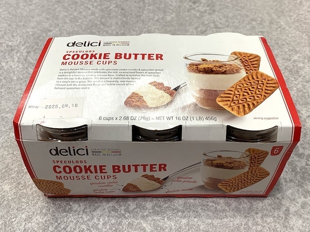 英語の文字が並ぶコストコらしい海外商品「クッキーバタームースカップ」は、ベルギー原産の本格派スイーツ。