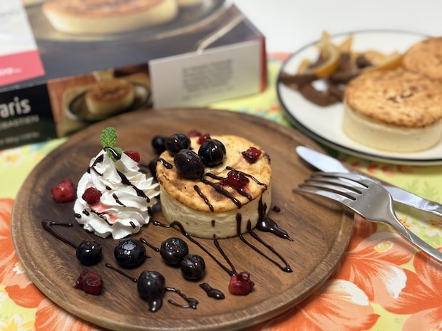 ホイップクリームやフルーツ、チョコソースを盛り付けてカフェ風にアレンジするのもおすすめ。個包装で冷凍保存ができるので、ストックしておくと便利ですよ♪