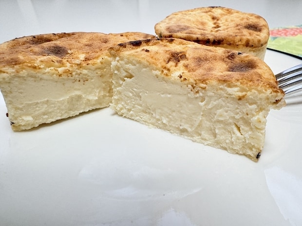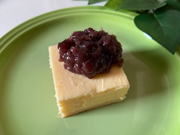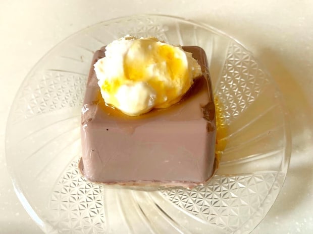 解凍前はカチコチですが、フィルムを取り除いて冷蔵庫で3時間ほど解凍するとなめらかな食感に。焼き色がついている表面はしっとりとして、スッと切れる滑らかな断面が美しいです。