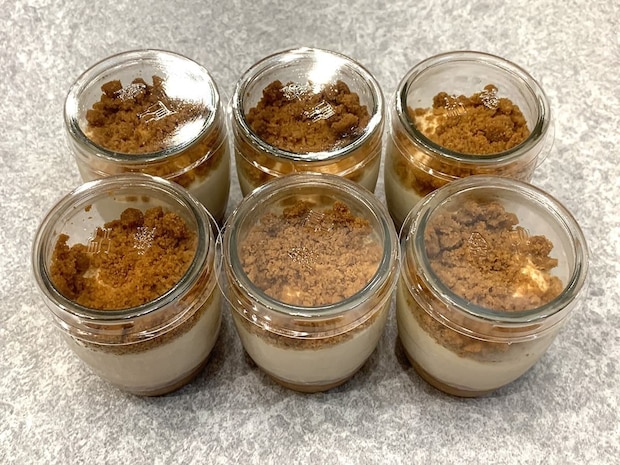 1個あたり76gとそれほど量は多くないので、食後のデザートタイムにもおすすめ。容器の蓋を開けると、上にたっぷりクッキーバタークランブルがかかっています。
