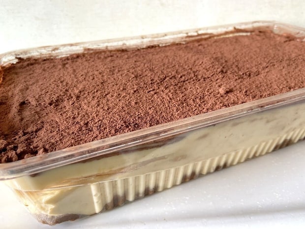 横長で深さのある容器にぎっしりと入ったティラミスは、表面にココアパウダーがたっぷりかかったシンプルな見た目です。