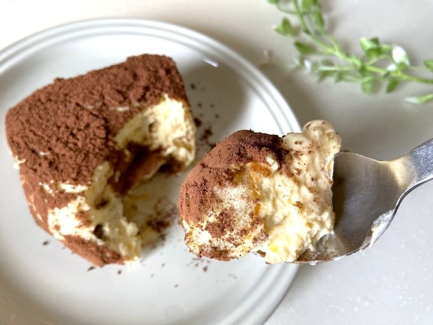 食べてみると、マスカルポーネチーズのクリーミーなコクと甘さに、ほろ苦いココアパウダーがたっぷりかかって大人な味わい。ビスケットのふんわりとした軽い食感と、コーヒーが染みてじゅわっとした部分の味の変化も楽しめます。