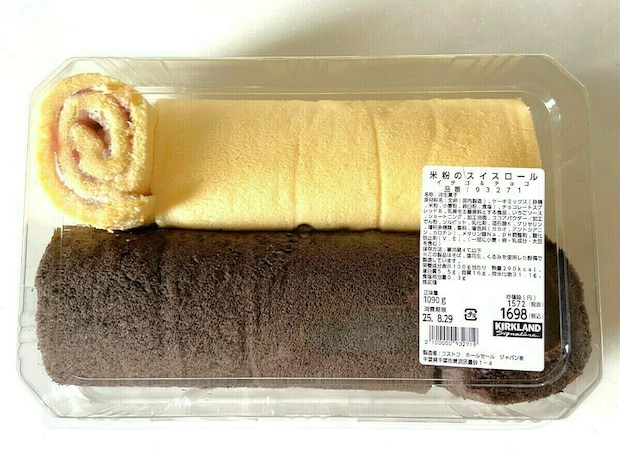 大きくて長い「米粉のスイスロール」。プレーン生地とチョコ生地の2本入りで長く愛されるロングセラー商品。