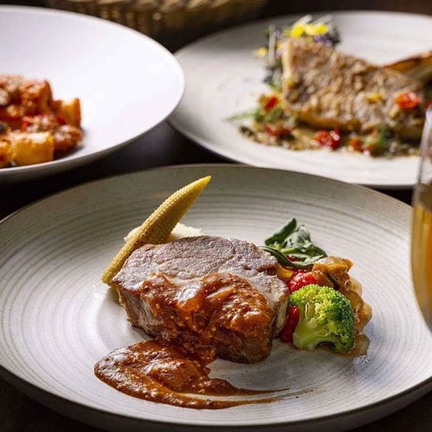 3時間飲み放題付きの「Saison Course」では、前菜盛り合わせ、季節のポタージュ、肉か魚か選べるメイン、パスタ、ドルチェと、華やかでいて充実度の高いラインナップ。スパークリングワインや生ビール、カクテルなど、40種以上の豊富なドリンクがそろうのも嬉しい。プールを眺めながら、ゆったり優雅な時間を過ごして。