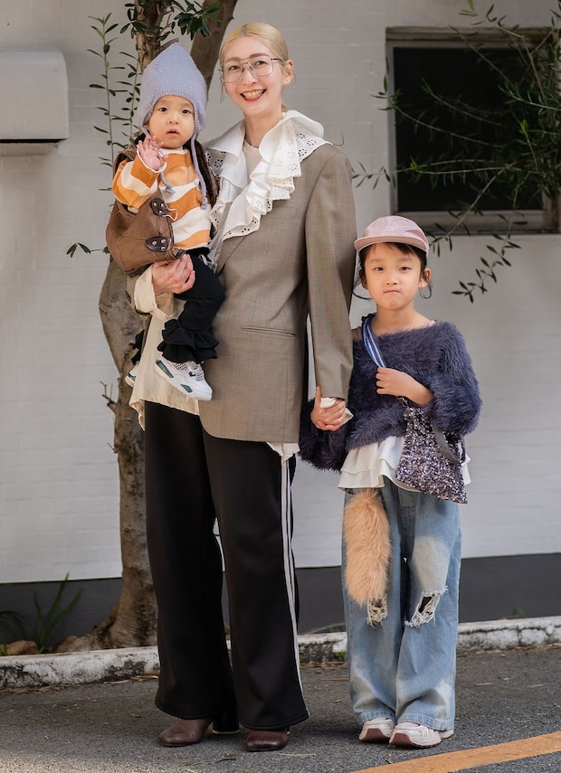 祖父母から受け継いだアイテムにを今どきにアップデートした家族コーデ! 甘辛やスポーティMIXなど、テイストのコントラストを楽しんだスタイリングセンスはお見事。コーディネートを一段と盛り上げてくれるヘアアレンジ術もお見逃しなく♪