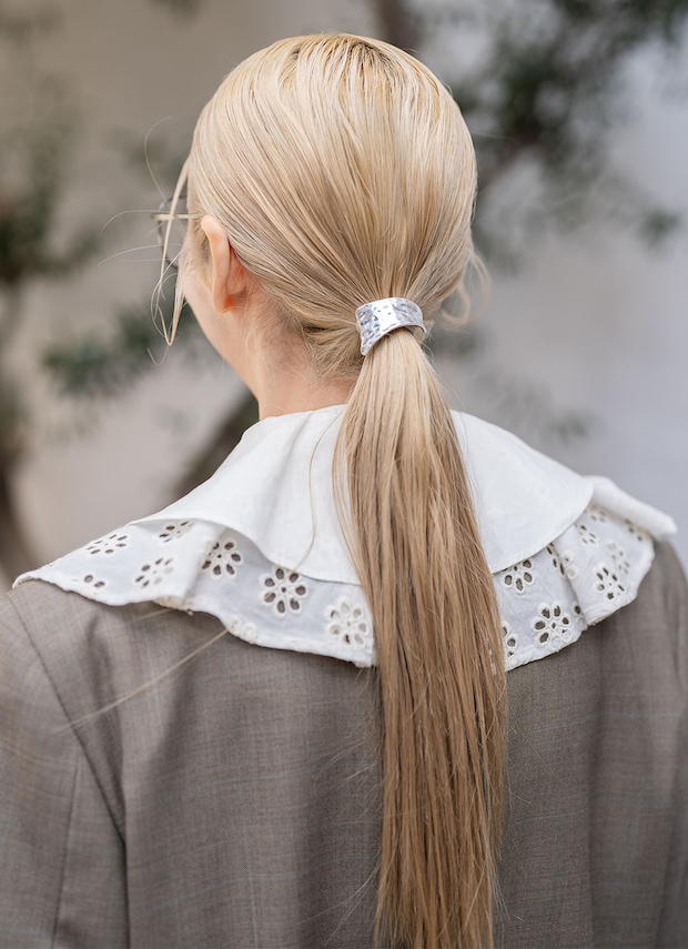 ローポニーでハイトーンカラーを生かしたスタイリング。シルバーのヘアカフを添えて、後ろ姿まで抜かりないおしゃれ心が光る。