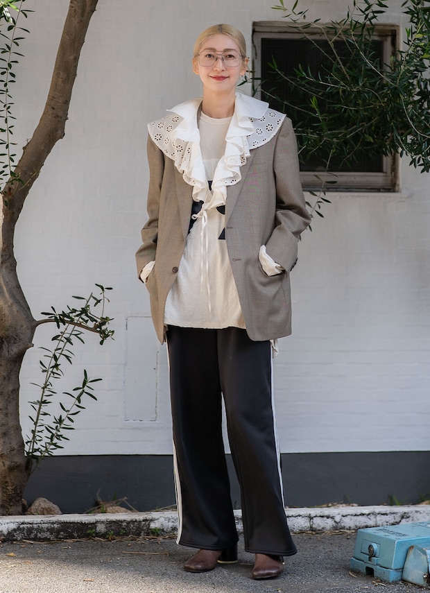 ツーブリッジメガネで知的なスパイスをオン。フリルたっぷりのつけ襟との甘辛バランスが絶妙!