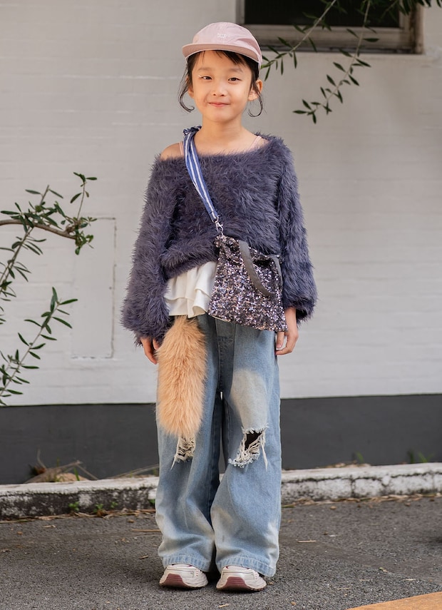 キラキラなスパンコールバッグはキッズのテンションも高まるアイテム。存在感あるストラップで投入するだけでおしゃれ見えが叶う。