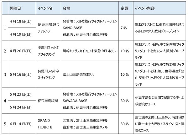 4月18日(土)~19日(日)にかけては、電動アシスト自転車で天城峠を越える非日常少人数制グループライド「伊豆天城越えチャレンジ」を開催。発着地はスルガ銀行サイクルステーションKANO BASEで、宿泊地は伊豆今井浜東急ホテル、定員は7名だ。