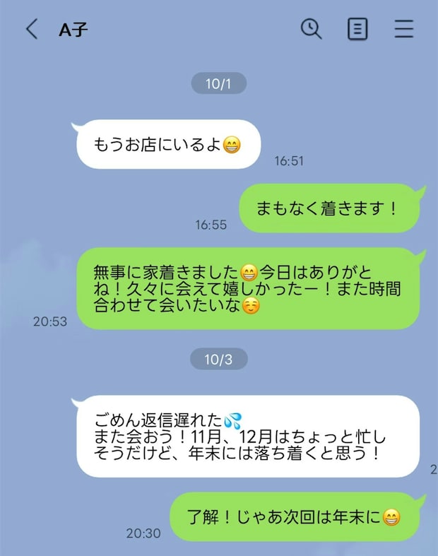 学生時代とは違い、お互いに生活があったり家族がいると自分だけのために使える時間というのは限られることも。とはいえ、「楽しかった」と伝えられて嫌な気持ちになる人はいないはずなので、投稿者さんの温かい習慣はすばらしいですよね。相手の反応は気にせず続けられるといいかもしれませんね。