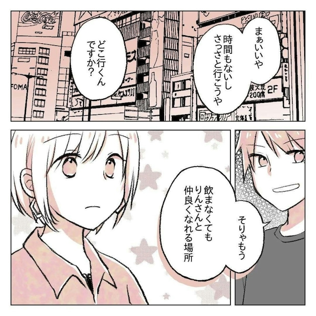 りんさんは、ゆーさんへのこれまでの態度を反省し、そのお詫びに今回の飲み代を払いました。もう帰るものだと思っていたら、ゆーさんが強引な方法で「二次会へ行く」とりんさんを誘います。それに激怒するりんさん、しかし終電までに帰れるならと思い直して…。