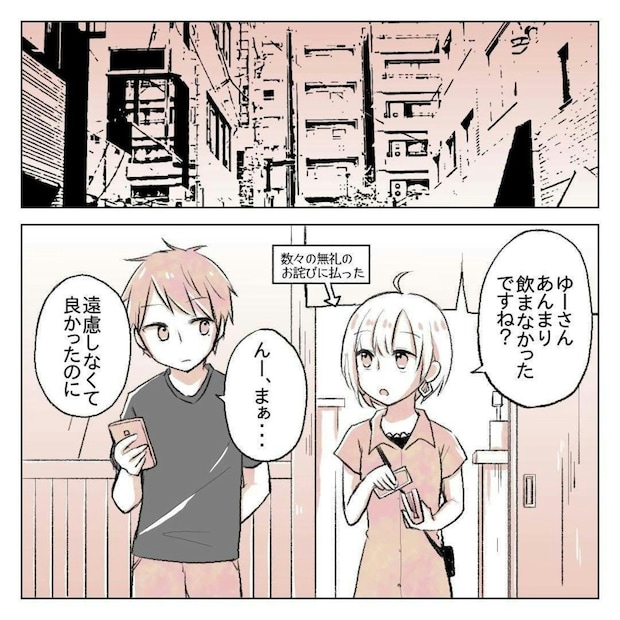 りんさんは、これまでのゆーさんへのお詫びとして今回の飲み代の支払いをしました。ゆーさんは、りんさんに遠慮してかあまり飲まなかったようです。