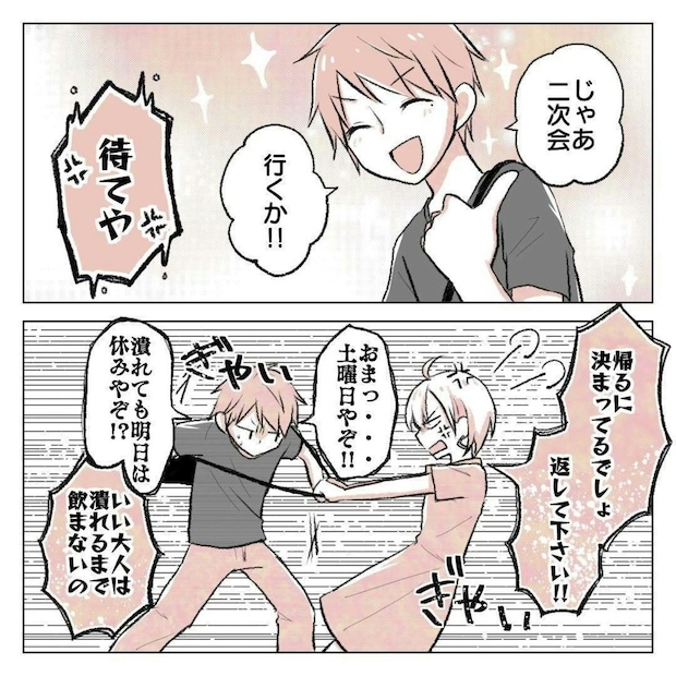 まさかのカバンをタテにしてりんさんと二次会に行こうという作戦に出たゆーさん。あっという間にカバンをうばわれたりんさんは、ゆーさんに怒りの抗議をします。