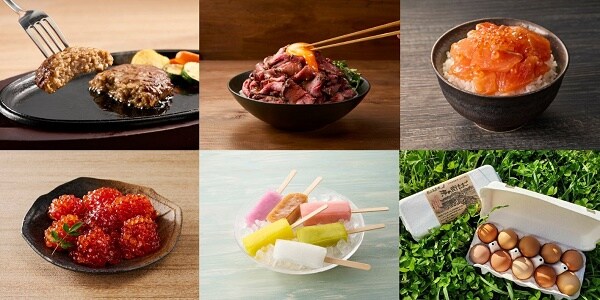 左上から順に、ありがとうハンバーグ(ホクビー)、北海道産ローストビーフ(ホクビー)、北海道産鮭ルイベ漬(佐藤水産)、北海道産手まり筋子(佐藤水産)、溶けないアイス くずバー(和洋菓子のなかむら)、平飼い有精卵 海の街たまご(飛ぶ鳥農場)