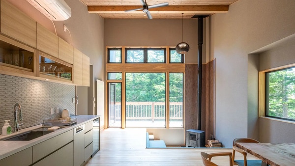 また、リビングの大きな窓に広がるのは、四季折々の景色。冬は葉が落ちて山の稜線がくっきりと浮かび上がり、夏は緑が窓を覆い、森に包まれるような静けさに。