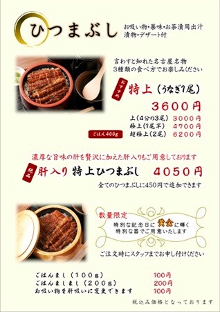 うなぎ丼もひつまぶしも、それぞれ「ごはんまし(100g)」100円(税込)や「ごはんましまし(200g)」200円(税込)でチュモンできるほか、お吸い物も100円(税込)で肝吸いに変更できる。