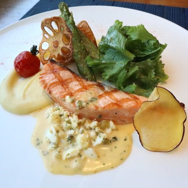 メインはなんと8種類(内2種は+1,500円)と、充実のラインナップ。お肉、魚介が4種ずつで今回は「タスマニアサーモンのグリル グリビッシュソース(※)」を選びました。香ばしく焼き上げられたサーモンは、程よい脂がのっており、ぎゅっと身が締まっているから食べ応え満点。ゆで玉子を使った、酸味のあるグリビッシュソースと合わせると、パンが進むこと間違いなしです。付け合わせのマッシュポテトやレンコンチップスなどと一緒に食べると、違った食感になるのも楽しいですよ。