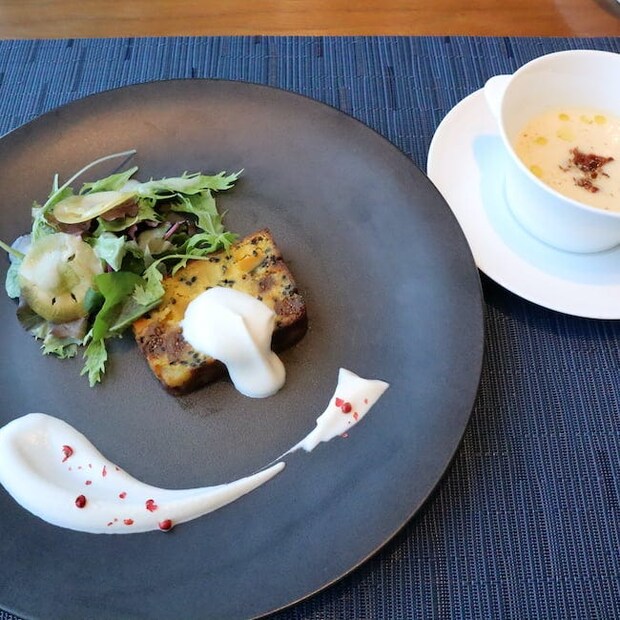 まず、前菜3種からチョイスしたのは、「かぼちゃ、さつまいも、いちじくのテリーヌ カルヴァドスクリーム」。かぼちゃとさつまいものほくほく&しっとりの中に、いちじくのつぶつぶ食感がアクセントになった逸品で、それぞれの甘さがぎゅっと詰まっています。そのままでもおいしいですが、りんごのブランデーのカルヴァドスを使ったクリームを付けると塩気やほのかな酸味、高い香りがプラスされ、より奥行きのある味わいに。