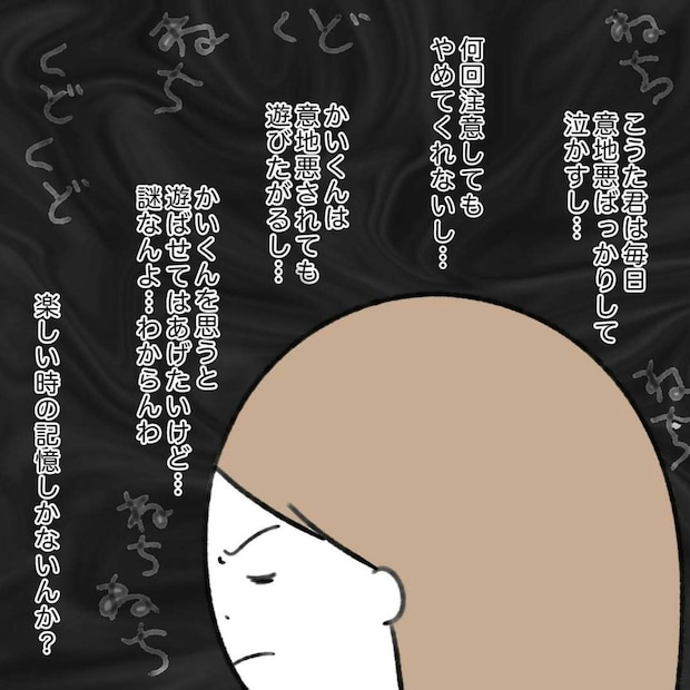 何とかネガティブ思考を振り払おうとしたかかじりさんですが、子どもたちのところに戻ってみると、やはりこうたくんがかいくんに意地悪をしていて、げっそりしています。