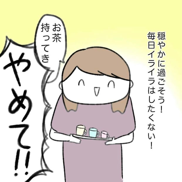 のどが渇いたと言ってかかじりさんにお茶を運ばせるこうたくん。自分の家に帰るよう促してもかかじりさんの言葉を聞き入れることはありません。そんなこうたくんの言動に振り回されて、かかじりさんのイライラはピークに達しています。