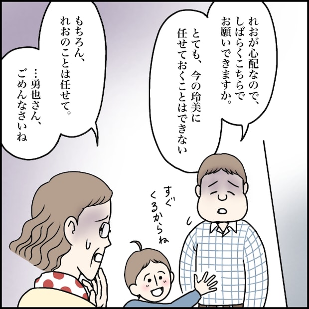 「れおが心配なので、しばらくこちらでお願いできますか?とても今の玲美に任せておくことはできない」そう話す勇也さんは、ひどく疲れ切った表情をしていました。義母はそんな勇也さんに「もちろん、れおのことは任せて・・・勇也さんごめんなさいね」と優しく声をかけます。