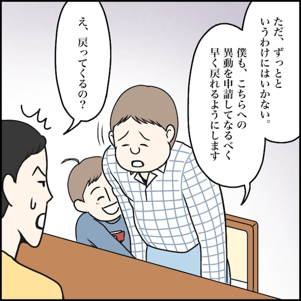勇也さんは、「ただ、ずっとというわけにはいかない、僕もこちらへの異動を申請してなるべく早く戻れるようにします」そう言って深く頭を下げました。その言葉を聞いた玲美さんは、「え、戻ってくるの?」と焦った表情を浮かべます。勇也さんが戻れば、今までのように自由に推し活ができなくなると思ったのでしょう。