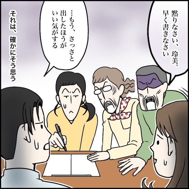 玲美さんのふざけた態度に耐えかねた義両親は、横から「黙りなさい玲美、早く書きなさい」と彼女を叱りつけました。さすがに両親に叱られて言い返せなくなったのか、玲美さんは大人しく離婚届に署名します。その様子を見た太一は、「・・・もう、さっさと離婚届を出したほうがいい気がする」と小さくつぶやきました。うん、私もそう思う。