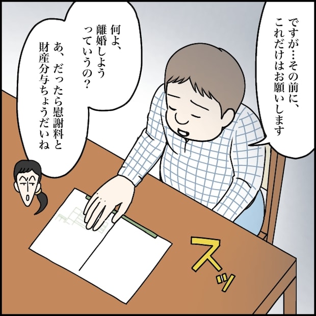 勇也さんは、玲美さんの言葉に反応することなく「ですが・・・その前にこれだけはお願いします」そう言って、静かに離婚届を差し出しました。それを見た玲美さんは、焦ることも悲しむこともせず、「何よ、離婚しようっていうの?だったら慰謝料と財産分与はしてね」と図々しく言い放ちました。