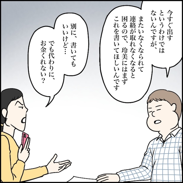 「今すぐ出すというわけではないんですが、またいなくなられて連絡が取れなくなると困るので、玲美にはまずこれを書いてほしいんです」勇也さんは感情を交えず、淡々とそう説明しました。しかし玲美さんは「別に書いてもいいけど・・・でも代わりにお金くれない?」と、この期に及んでもなお、図々しくお金を要求します。