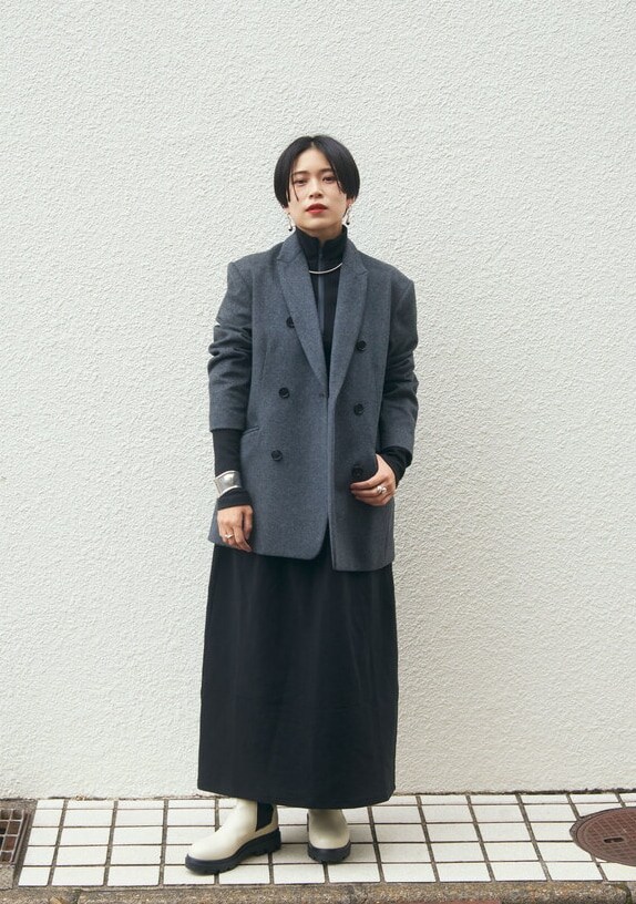 「全体的にダークな色合いなのでブーツやジュエリーなど小物にポイントを持たせました。アモーメントのドレスは広がり過ぎず、襟元もジップ仕様でフェミニン過ぎないところがお気に入り」