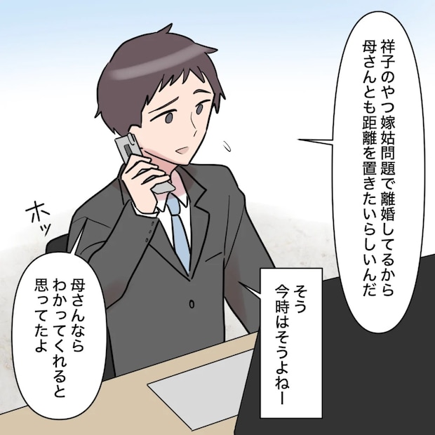 渉はさらに、「祥子のやつ、嫁姑問題で離婚してるから母さんとも距離を置きたいらしいんだ」と続けました。もともと相手の女性と会うつもりはなかった私は、「そう、今時はそうよねー」と軽く受け流します。すると渉は、ほっとした表情で「母さんならわかってくれると思ってたよ」と言いました。