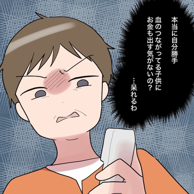 本当に自分勝手としか言いようがありません。血のつながった子どもにお金を出さず、血のつながっていない子どもにはお金を出したいなんて呆れます。こんな無責任な男が自分の息子だなんて・・・虫唾が走りました。