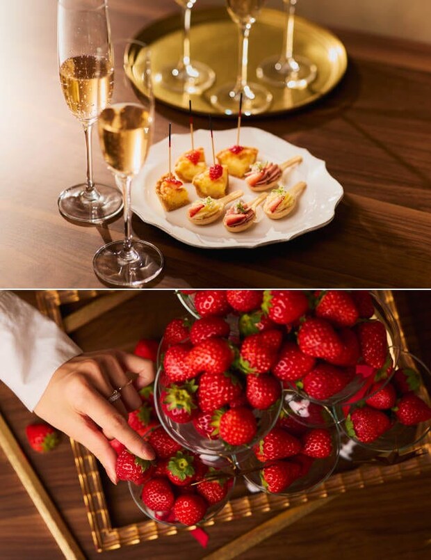 新章を刻む「All Day Dining La Jyho」が贈るストロベリースイーツパーティの始まりは、期待感を盛り上げるウェルカムドリンクとフィンガーフード。また、フレッシュのブランドいちご5種類も用意されるので、食べ比べを楽しみながら心ゆくまで旬のいちごを味わって。