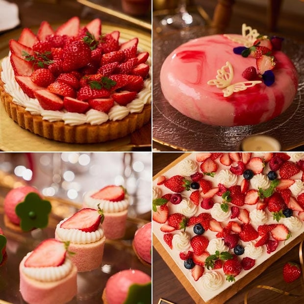 ホテルメイドのスイーツは、いちごをふんだんに使用した「タルトフレーズ」や、蝶のモチーフがあしらわれたつややかな「ミラームース」、ひと口サイズがかわいらしい「ロールケーキ」に、いちごたっぷりの「ショートケーキ」など、心躍る品々が盛りだくさん。このほかにも「パンナコッタ」や「いちご大福」、「レアチーズケーキ」など、多彩なスイーツたちを好きなだけ召し上がれ。